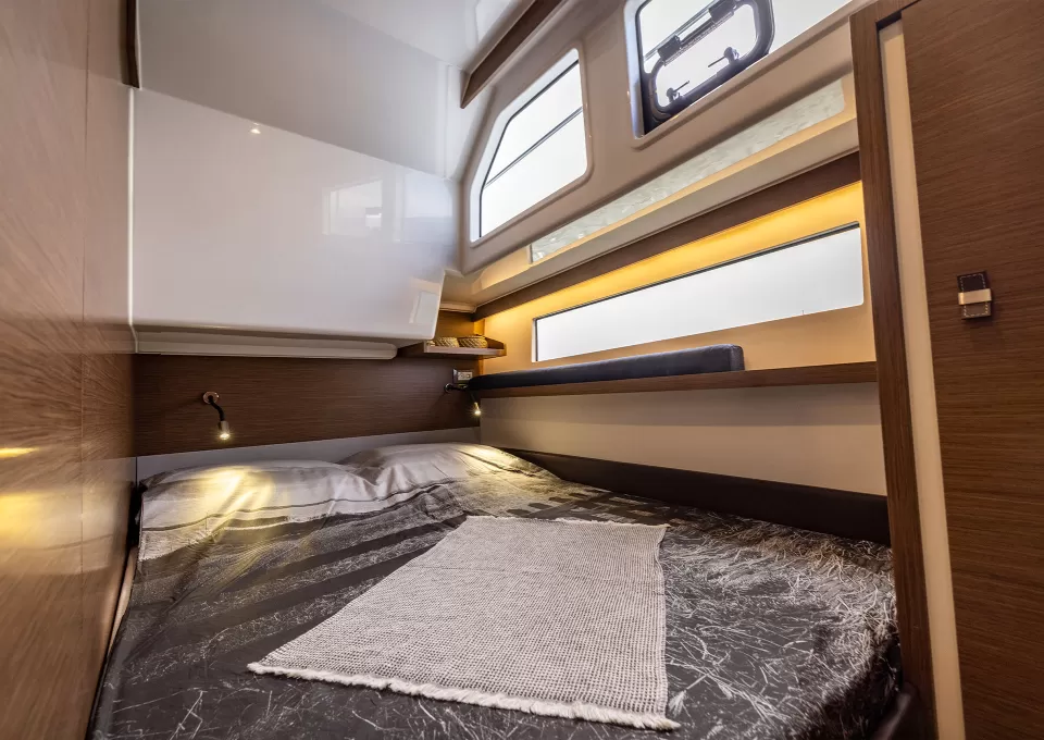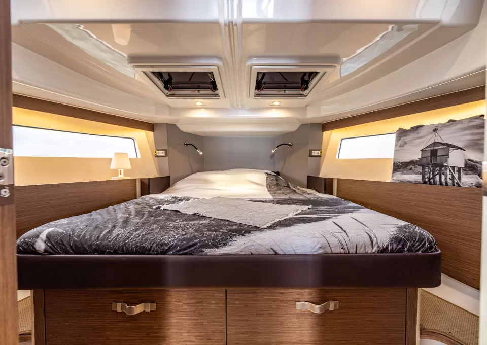 The Delphia 11 FlyLounge cabins feature clever interior design with spacious beds and ingenious storage solutions, so you can relax in peace during your trip. The private bathrooms have been designed with high-end finishes, so you can make the most of your retreat on the water in total simplicity.